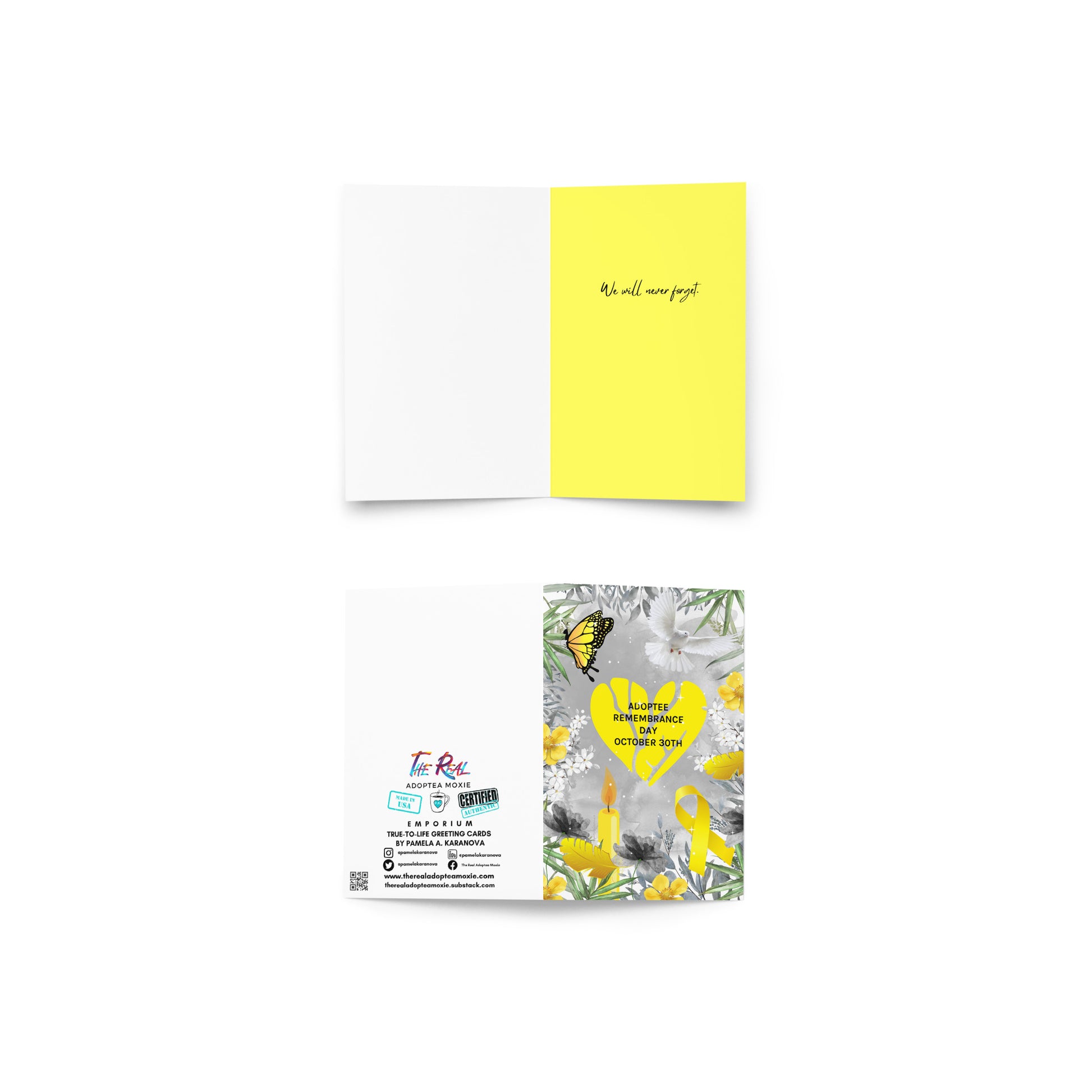 This card is sentimental for many reasons, especially for anyone who knows and loves an adoptee. Adoptee Remembrance Day - October 30th is a day to acknowledge the loss every adoptee experiences before they are adopted. It's also a day to honor the deportation of adoptees whose citizenship wasn't finalized by adoptive parents, adoption attorneys, etc. It also acknowledges the staggering statistics of adoptees being over-represented in prisons, jails, mental health and treatment facilities and being four times more likely to attempt suicide. It's also a day to honor all the adoptees who didn't make it by ending their own lives, and all the adoptees who have been murdered or abused by their adoptive parents. This day was created by Pamela A. Karanova. To learn more about ARD visit the website. www.adopteeremembranceday.com