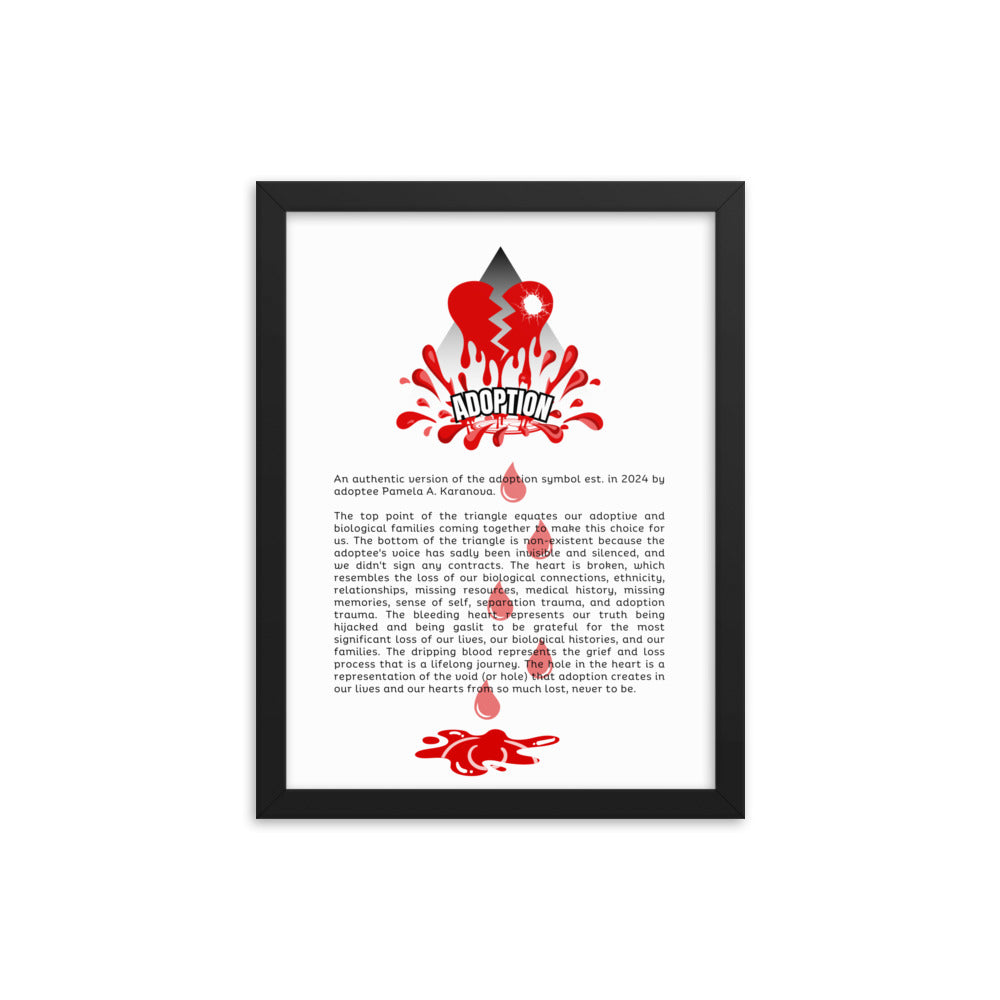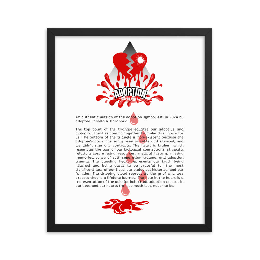 "An authentic version of the adoption symbol est. in 2024 by adoptee Pamela A. Karanova. The top point of the triangle equates our adoptive and biological families coming together to make this choice for us. The bottom of the triangle is non-existent because the adoptee's voice has sadly been invisible and silenced, and we didn't sign any contracts. The heart is broken, which resembles the loss of our biological connections, ethnicity, relationships, missing resources, medical history, missing memories, sense of self, separation trauma, and adoption trauma. The bleeding heart represents our truth being hijacked and being gaslit to be grateful for the most significant loss of our lives, our biological histories, and our families. The dripping blood represents the grief and loss process that is a lifelong journey. The hole in the heart is a representation of the void (or hole) that adoption creates in our lives and our hearts from so much lost, never to be."