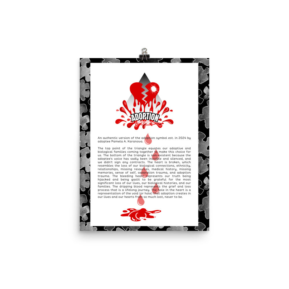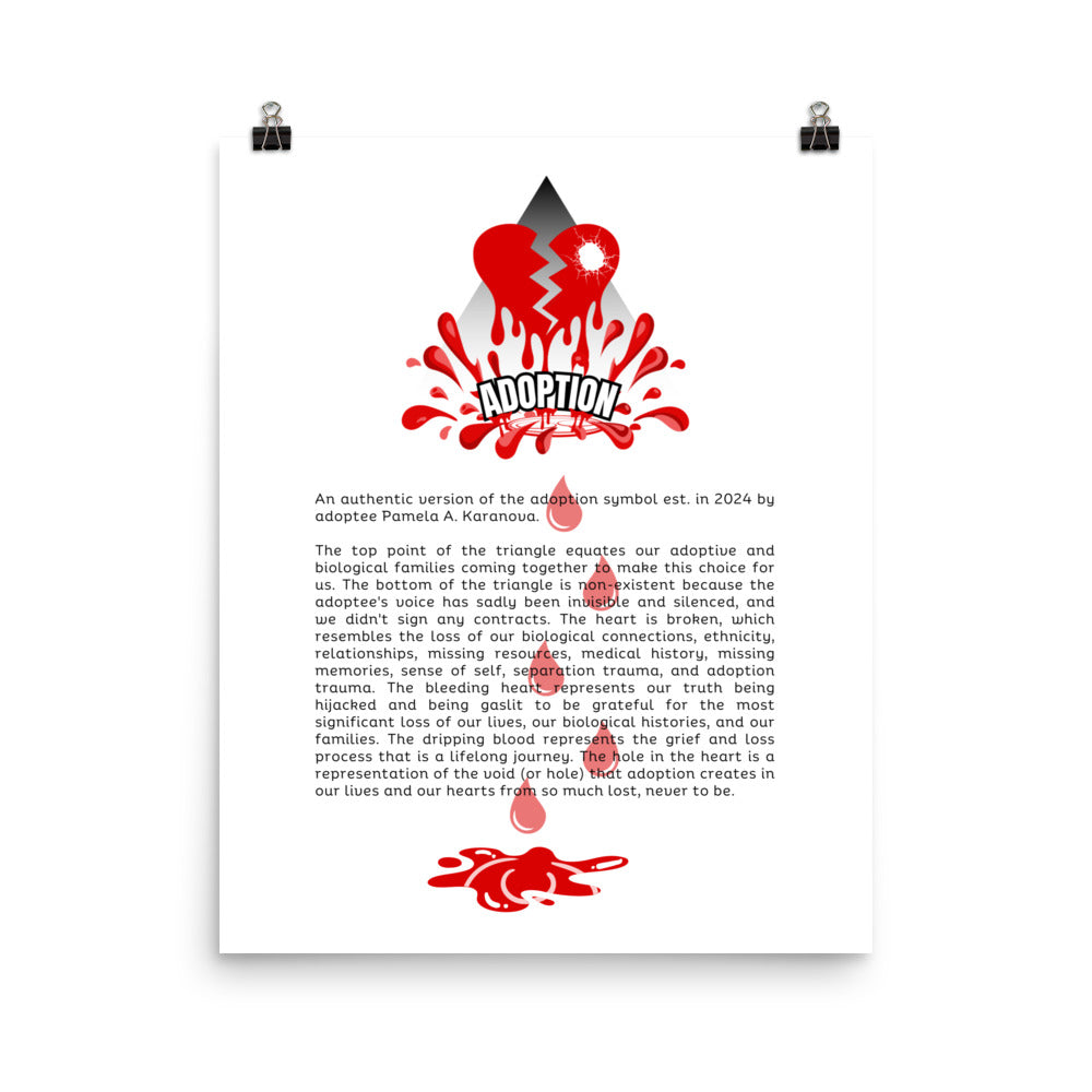"An authentic version of the adoption symbol est. in 2024 by adoptee Pamela A. Karanova. The top point of the triangle equates our adoptive and biological families coming together to make this choice for us. The bottom of the triangle is non-existent because the adoptee's voice has sadly been invisible and silenced, and we didn't sign any contracts. The heart is broken, which resembles the loss of our biological connections, ethnicity, relationships, missing resources, medical history, missing memories, sense of self, separation trauma, and adoption trauma. The bleeding heart represents our truth being hijacked and being gaslit to be grateful for the most significant loss of our lives, our biological histories, and our families. The dripping blood represents the grief and loss process that is a lifelong journey. The hole in the heart is a representation of the void (or hole) that adoption creates in our lives and our hearts from so much lost, never to be."