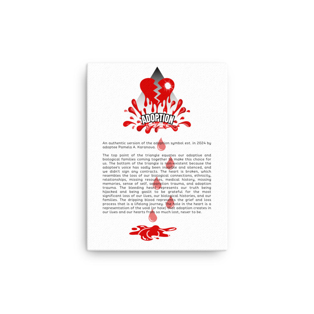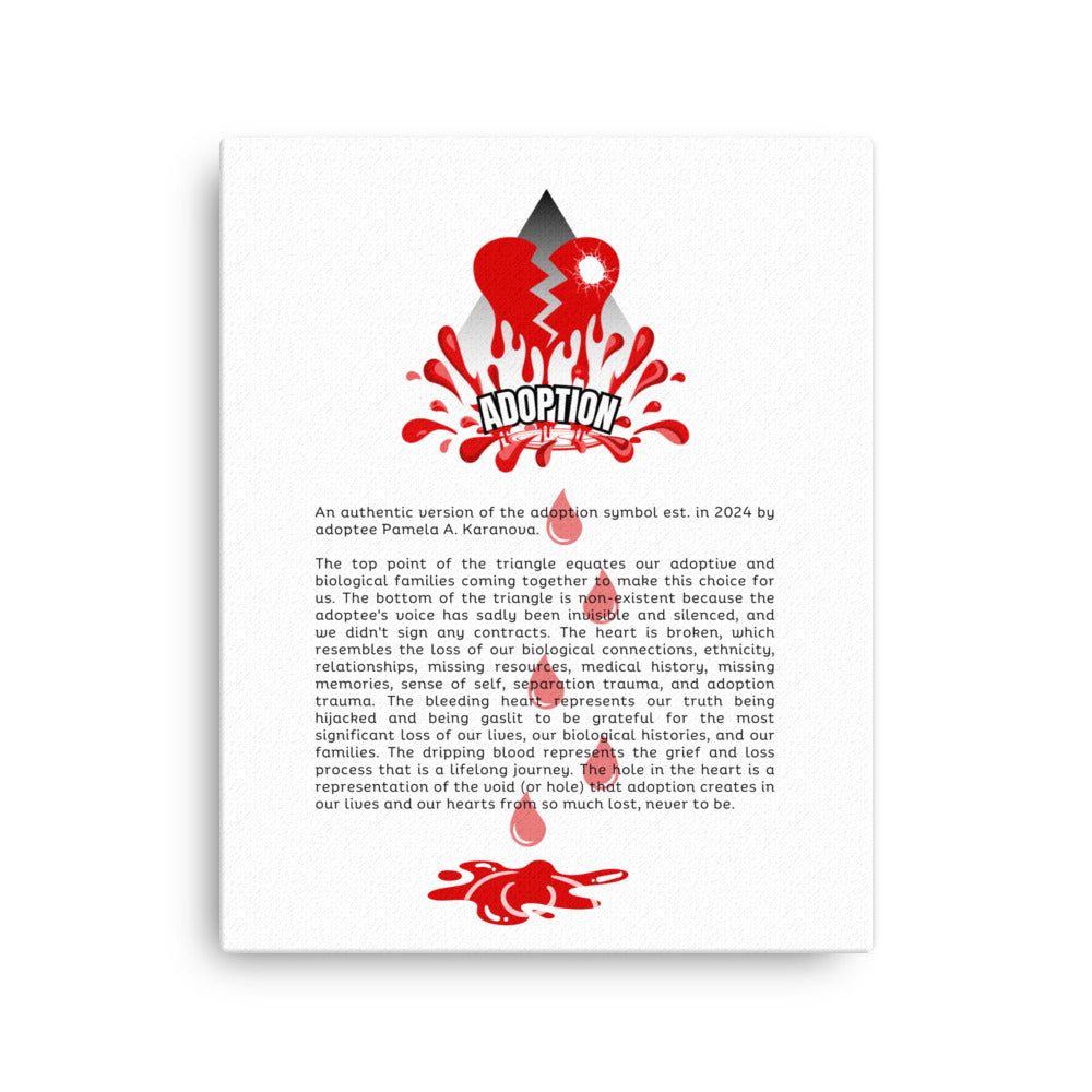 "An authentic version of the adoption symbol est. in 2024 by adoptee Pamela A. Karanova. The top point of the triangle equates our adoptive and biological families coming together to make this choice for us. The bottom of the triangle is non-existent because the adoptee's voice has sadly been invisible and silenced, and we didn't sign any contracts. The heart is broken, which resembles the loss of our biological connections, ethnicity, relationships, missing resources, medical history, missing memories, sense of self, separation trauma, and adoption trauma. The bleeding heart represents our truth being hijacked and being gaslit to be grateful for the most significant loss of our lives, our biological histories, and our families. The dripping blood represents the grief and loss process that is a lifelong journey. The hole in the heart is a representation of the void (or hole) that adoption creates in our lives and our hearts from so much lost, never to be."