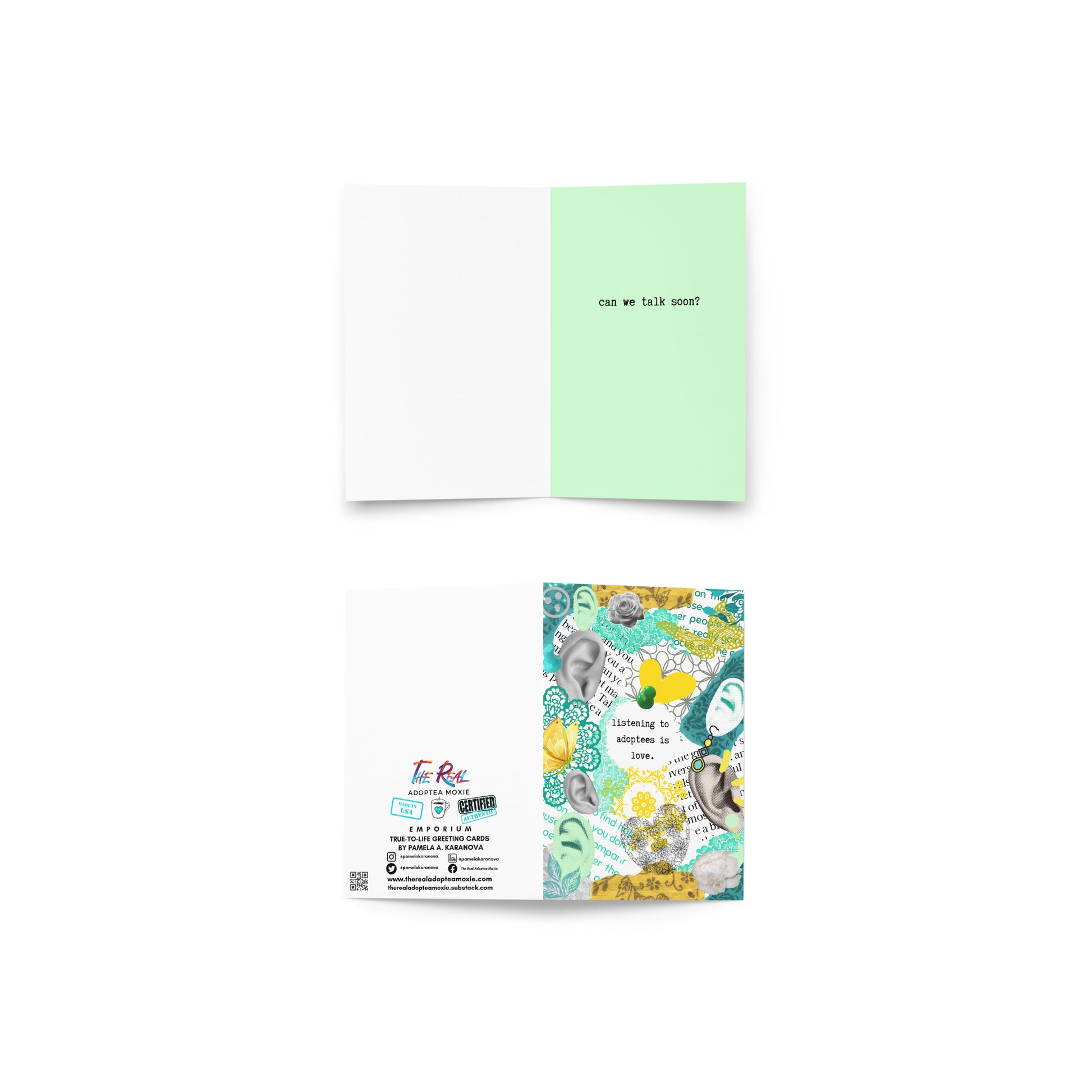 "Can We Talk Soon" Adoptee Greeting Card: Each item becomes a bold and unique statement, and every true-to-life greeting card tells a story.