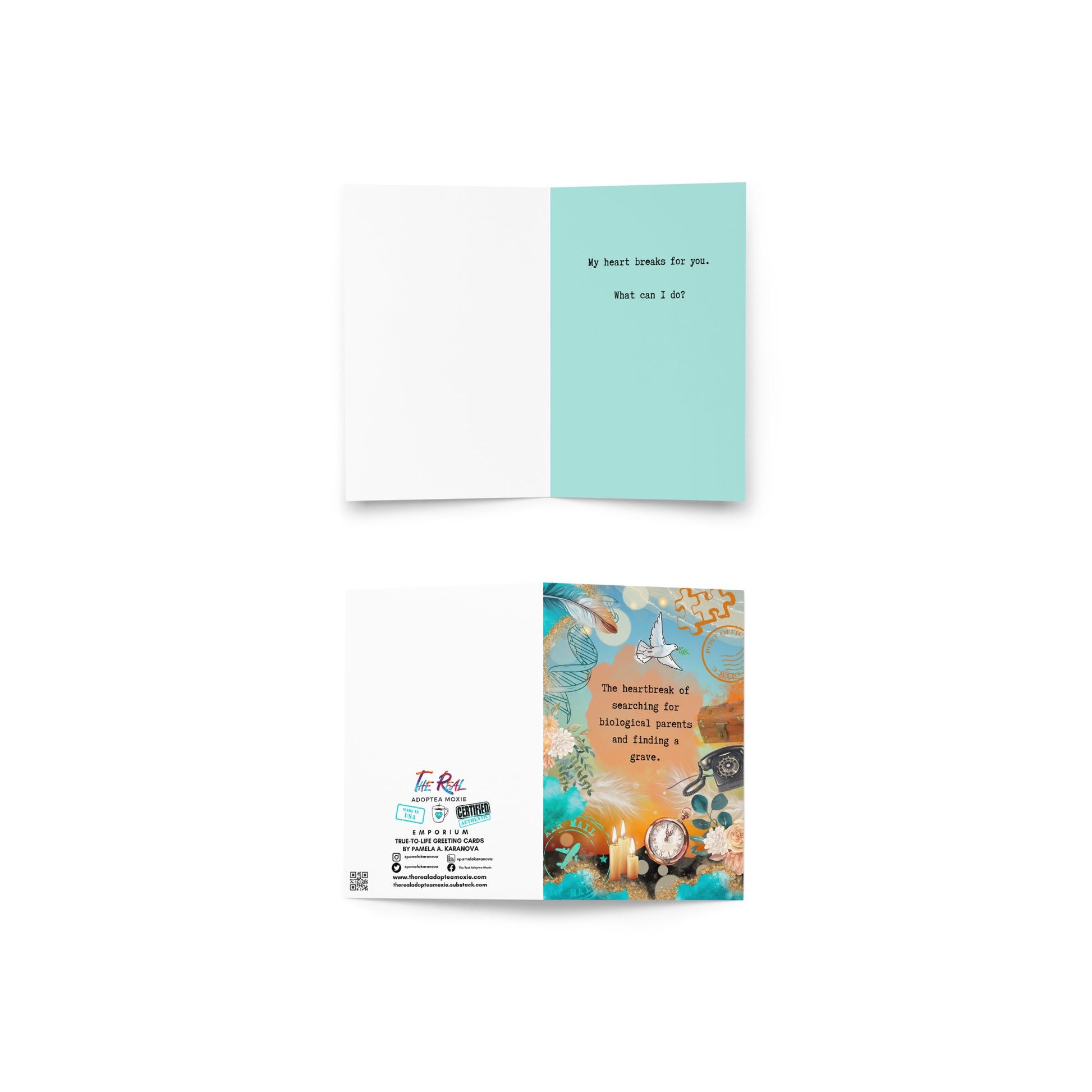 Front of Card: "The heartbreak of searching for biological parents and finding a grave."
