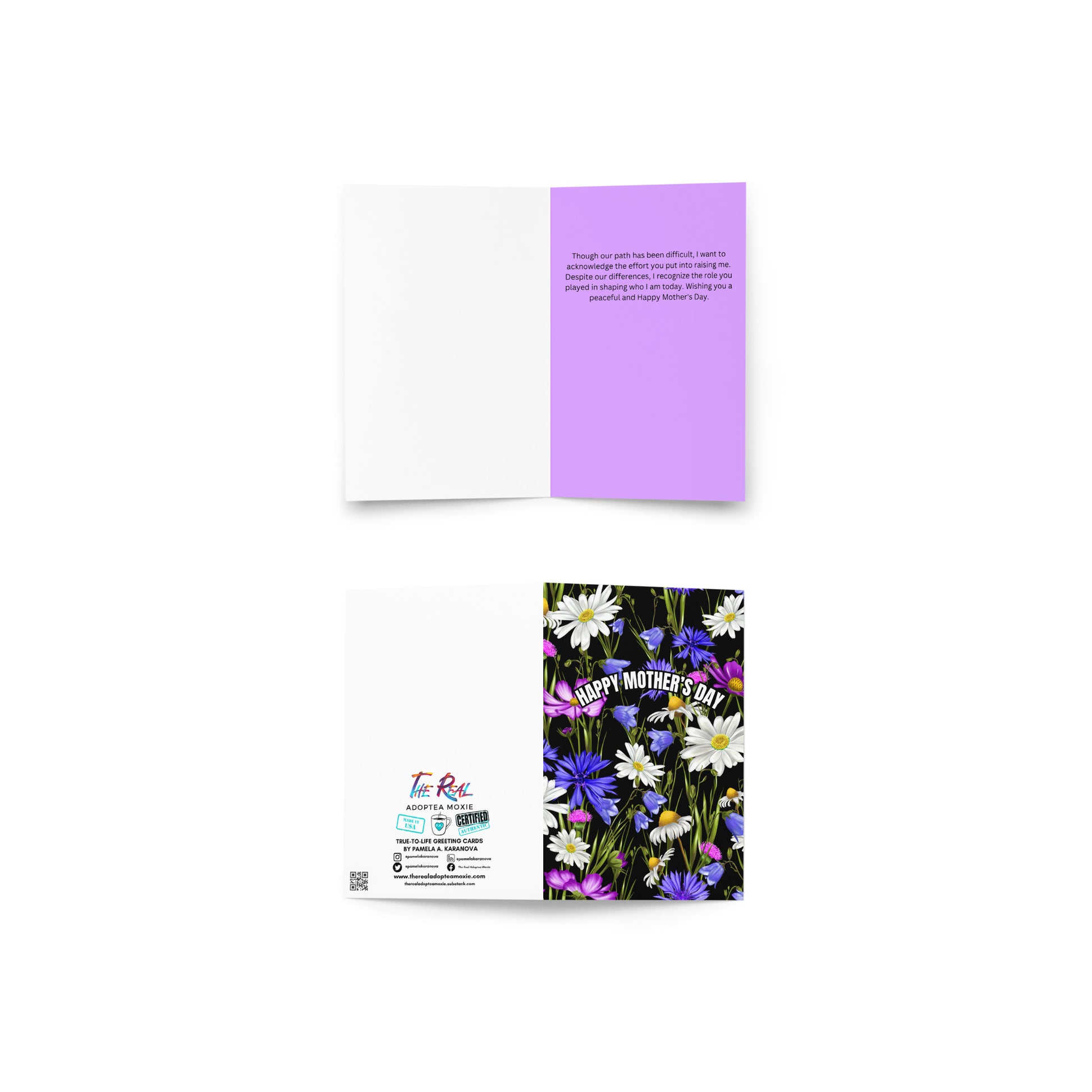 This greeting card speaks to many individuals in reference to our adoptive mothers or any mother who raised us for Mother's Day. It isn't easy to find the right greeting card that fits how we feel, and finding the right words to say is hard sometimes. This card is a great addition to the honor of the difficult day we call Mother's Day.