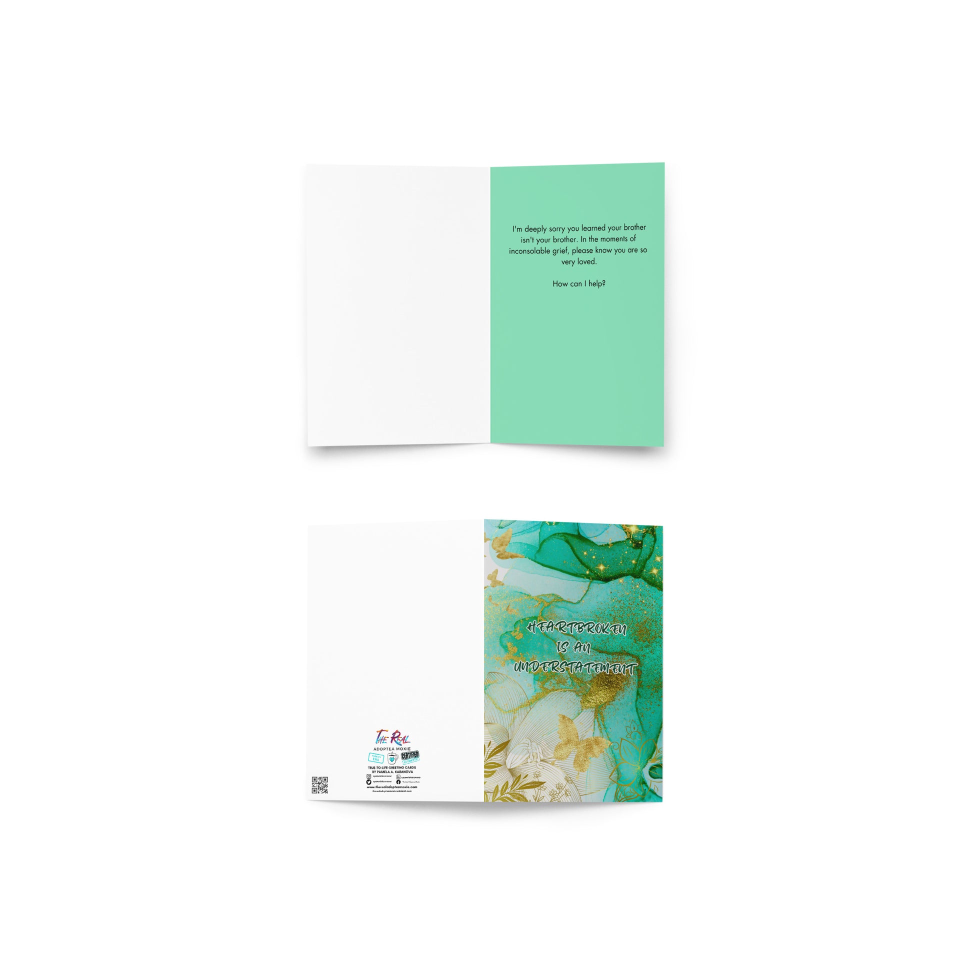 Inside Card: "I'm deeply sorry you learned your brother isn't your brother. In the moments of inconsolable grief, please know you are so very loved. How can I help?"