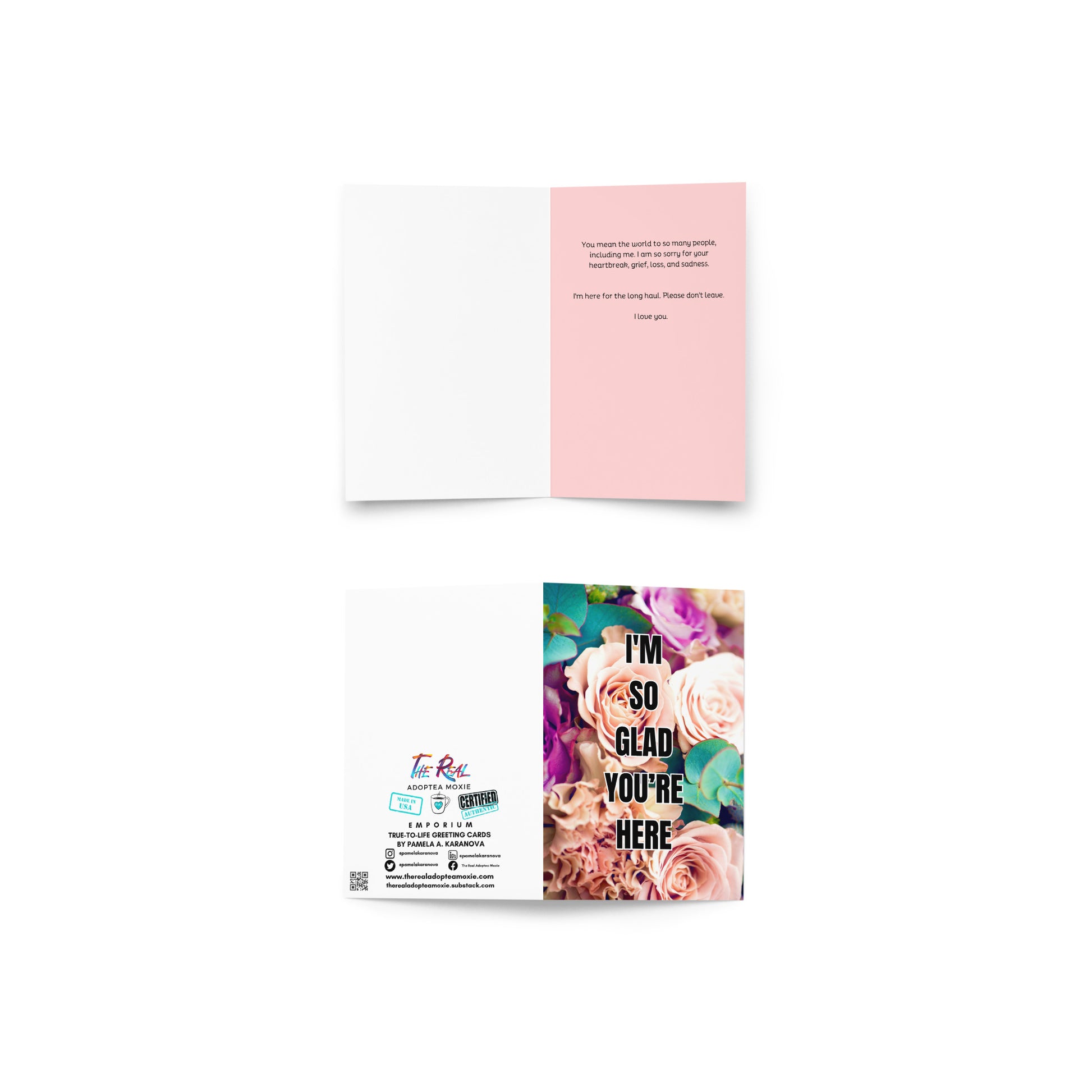 Disclaimer: The Real Adoptea Moxie True-to-Life Greeting Card line is protected by copyright laws. Any unauthorized reproduction, distribution, or modification of the content shared on this website without the explicit written consent of the copyright holder is strictly prohibited. This includes both personal and commercial use. All rights reserved. Thank you for respecting the creative work of Pamela A. Karanova and ensuring its rightful protection.
