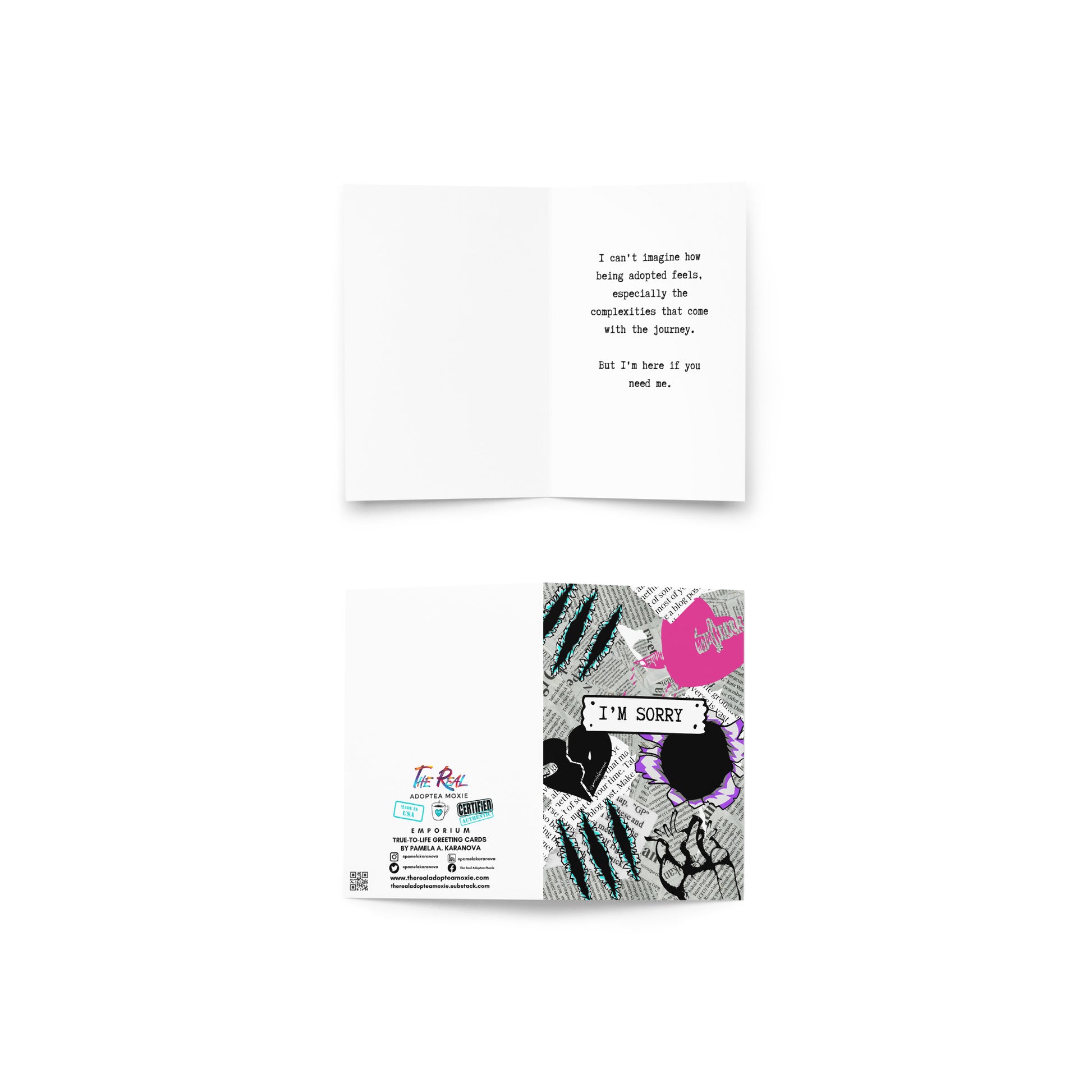 Disclaimer: The Real Adoptea Moxie True-to-Life Greeting Card line is protected by copyright laws. Any unauthorized reproduction, distribution, or modification of the content shared on this website without the explicit written consent of the copyright holder is strictly prohibited. This includes both personal and commercial use. All rights reserved. Thank you for respecting the creative work of Pamela A. Karanova and ensuring its rightful protection.