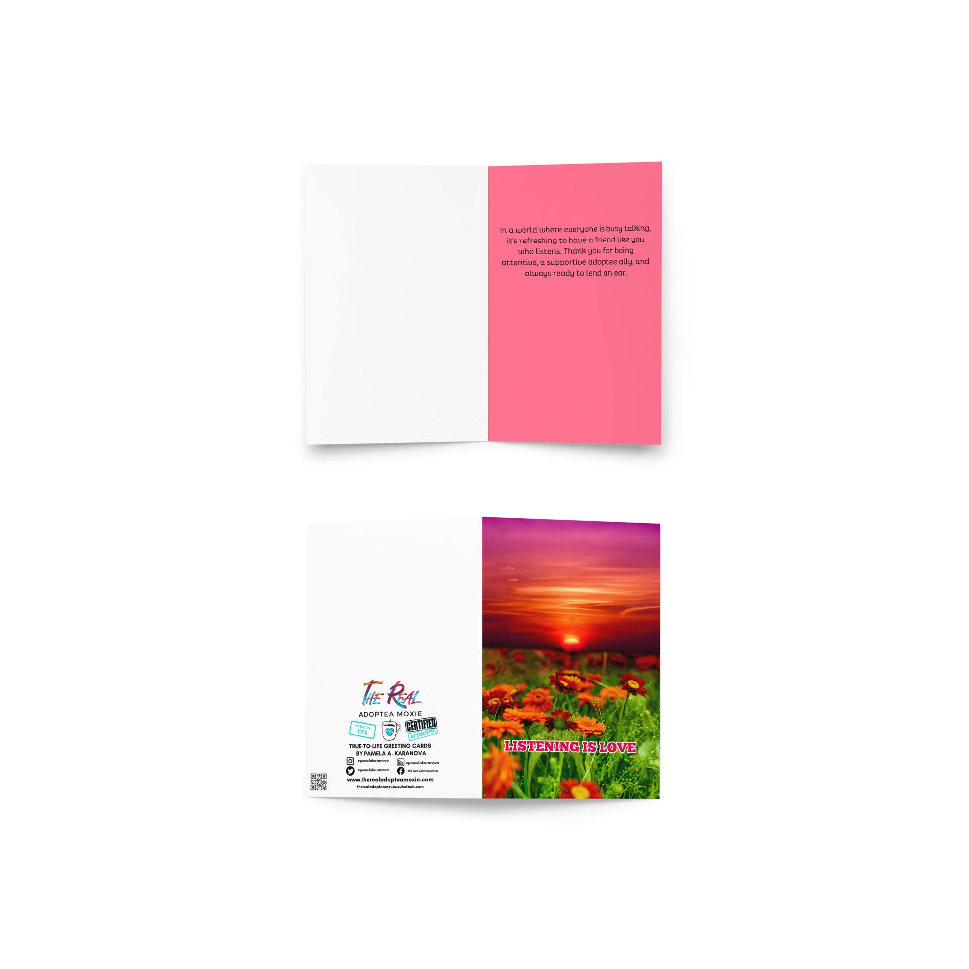 Inside Card: "In a world where everyone is busy talking, it's refreshing to have a friend like you who listens. Thank you for being attentive, a supportive adoptee ally, and always ready to lend an ear!"