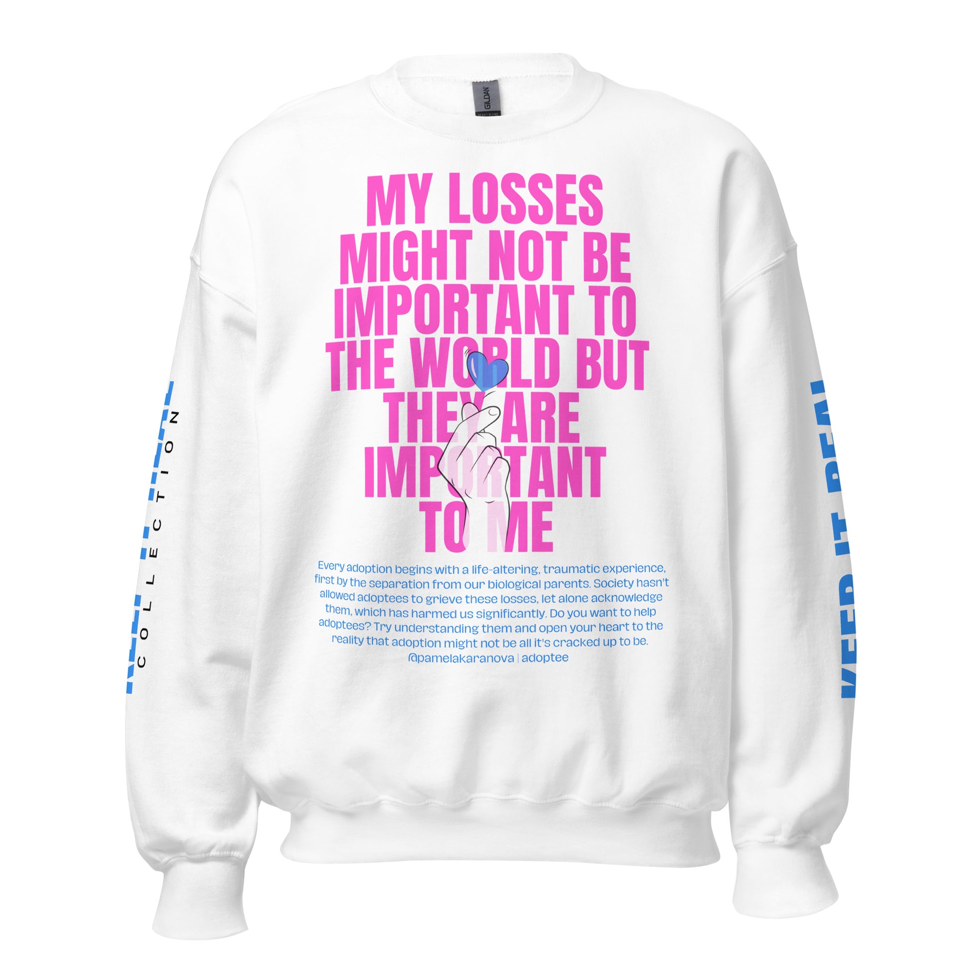 Let's keep it real: Do you want to help adoptees? Try understanding them and open your heart to the reality that adoption might not be all it's cracked up to be. Embrace the allure of this wearable masterpiece and redefine your wardrobe with this powerful sweatshirt - where every item in the "Keep It Real" collection tells a story.