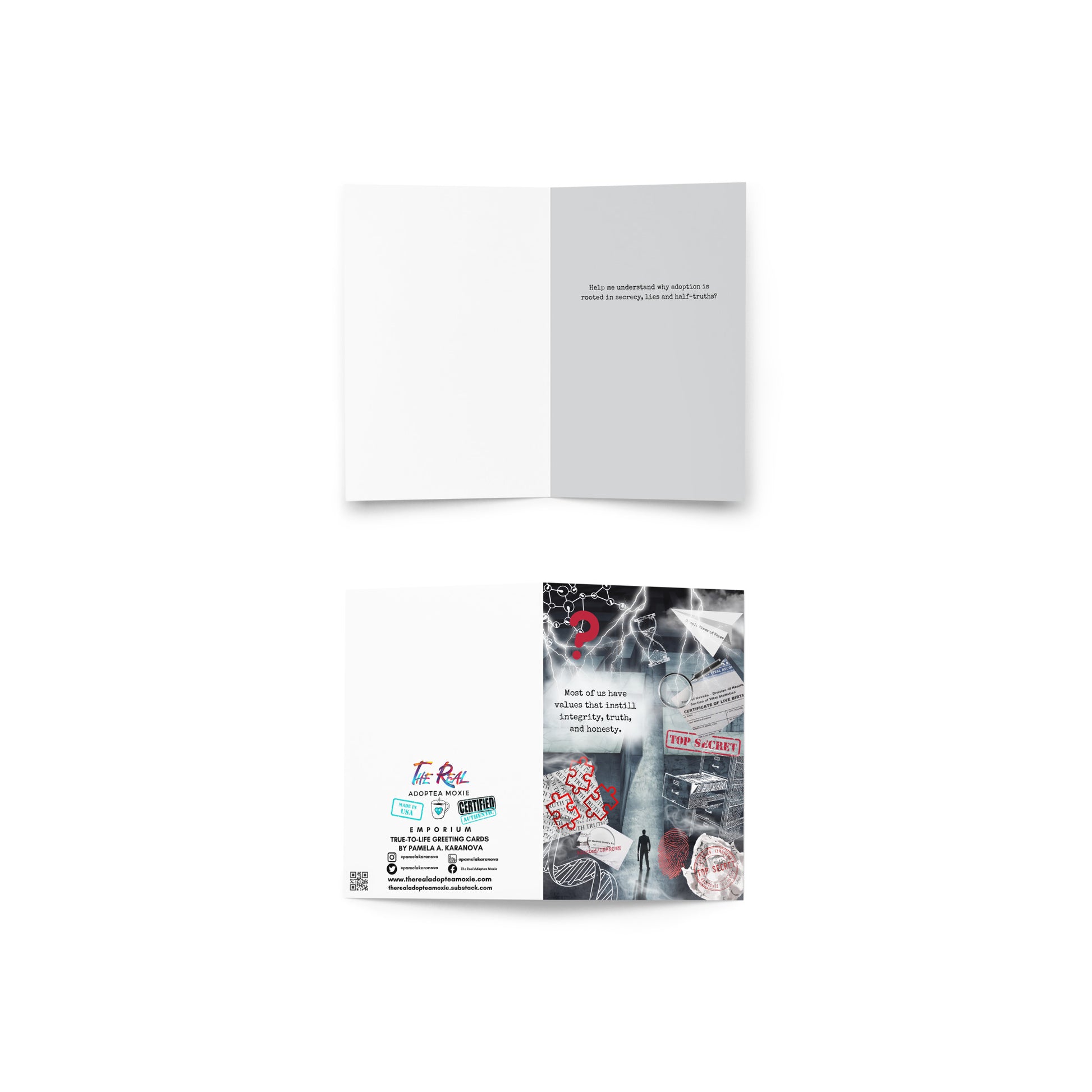 Inside Card: "Help me understand why adoption is rooted in secrecy, lies, and half-truths."