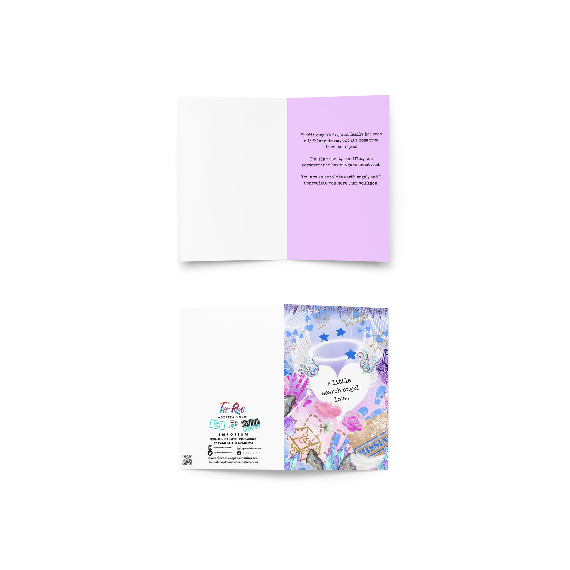 Inside Card: "Finding my biological family has been a lifelong dream, but it's come true because of you! The time spent, sacrifice, and perseverance haven't gone unnoticed. You are an absolute earth angel, and I appreciate you more than you know! "
