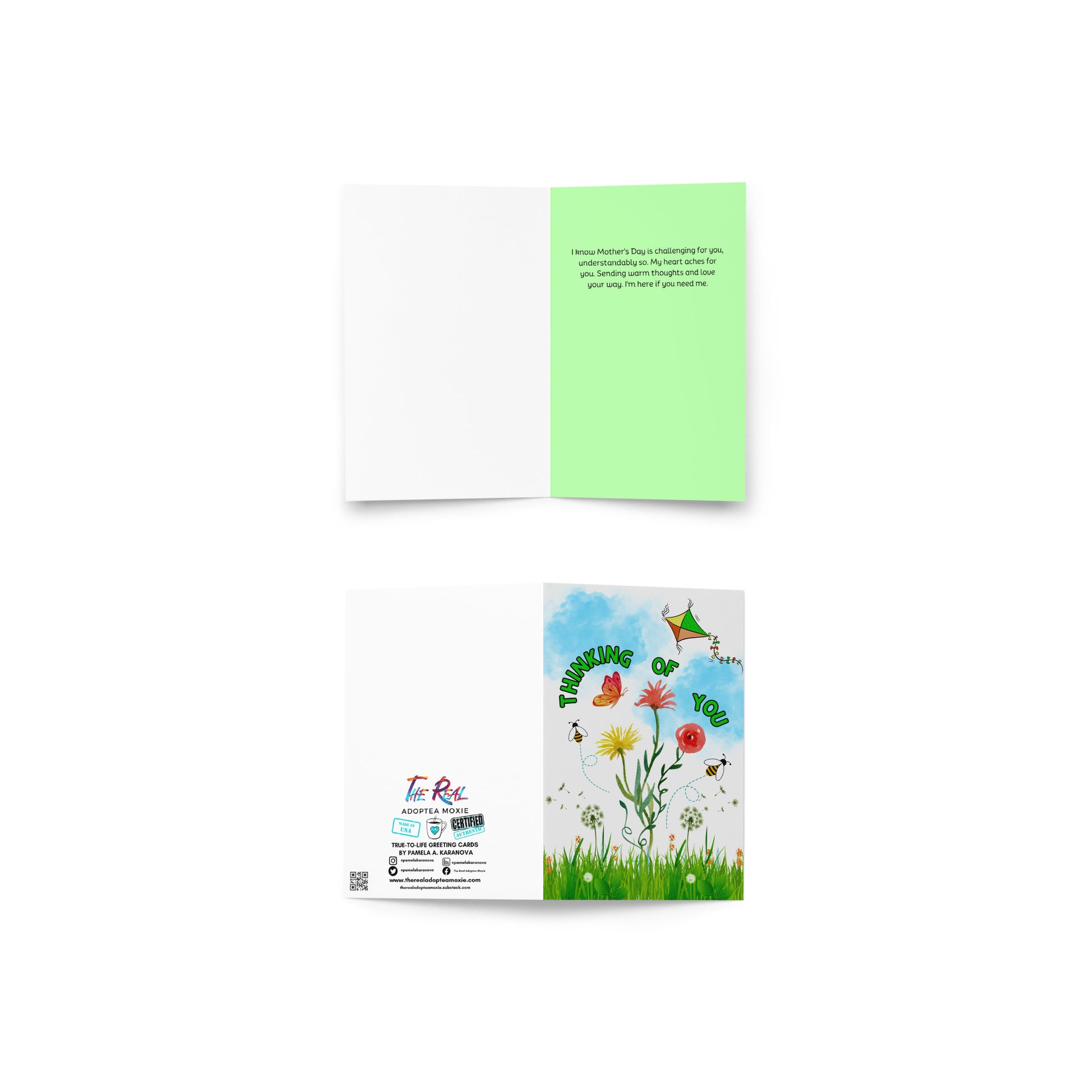 This greeting card speaks to many individuals in reference to our biological mothers or ALL mothers for Mother's Day. Do you know a biological mother who lost their baby to adoption? This card is to acknowledge the challenge of the day. It can also reference any mother who had an open adoption closed by the adoptive parents. Talk about a profound loss and trauma that is unimaginable to most first mothers. It isn't easy to find the right greeting card that fits how we feel, and finding the right words to say is hard sometimes. This card is a great addition to the honor of the difficult day we call Mother's Day.