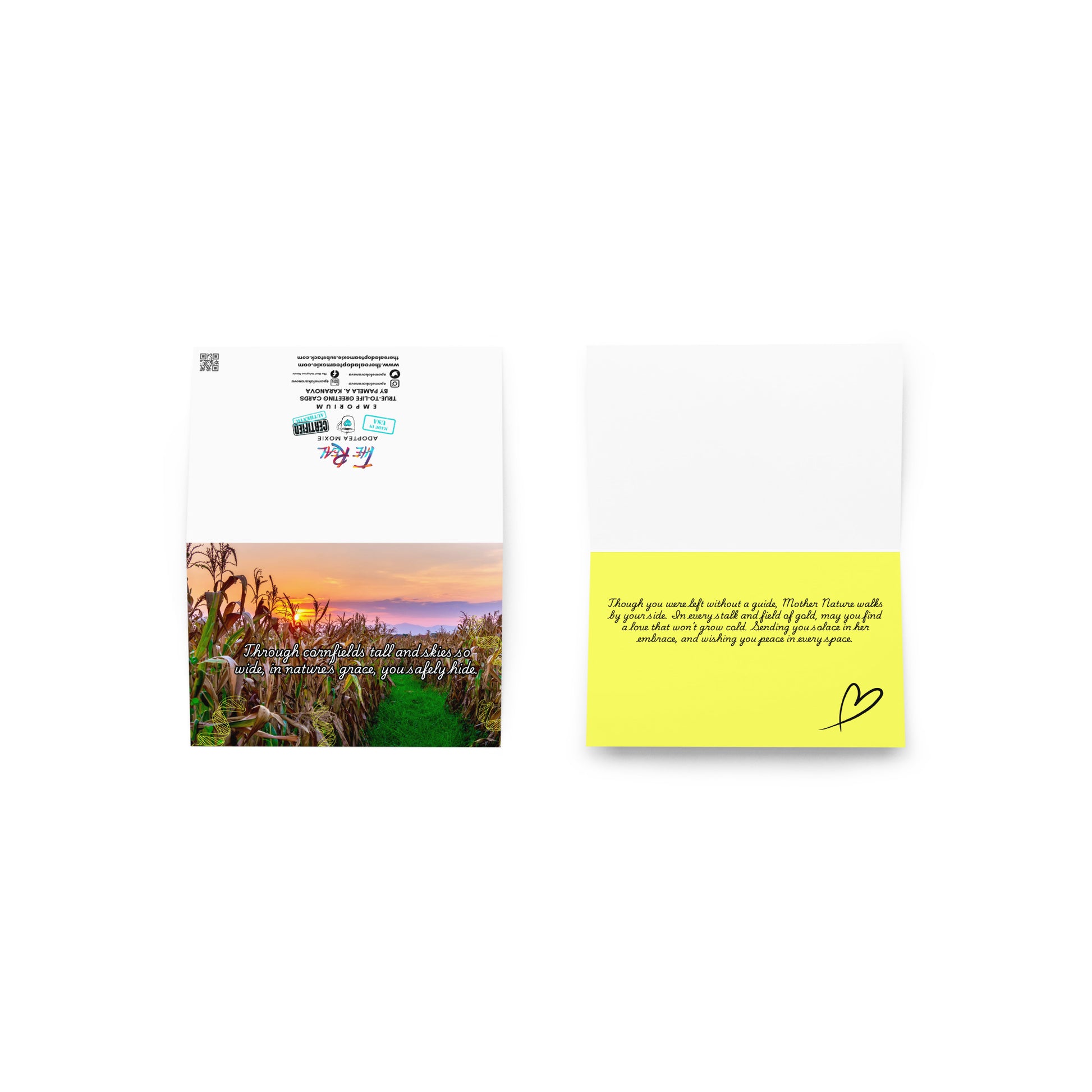 Front of Card: "Through cornfields tall and skies so wide, in natures grace, you safely hide."