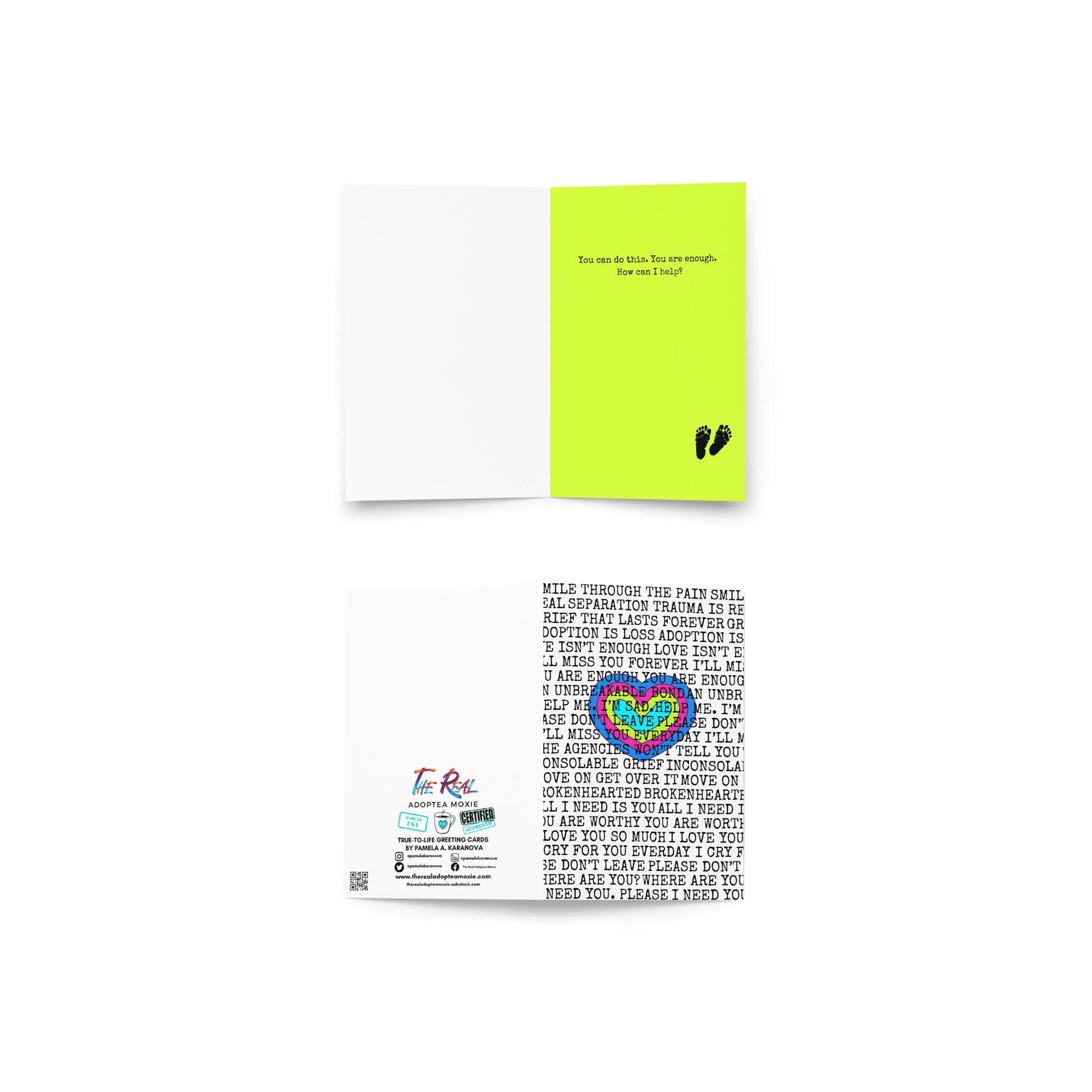 Front of Card: "Smile through the pain, separation trauma is real, grief that last forever, love isn't enough, I'll miss you forever, you are enough, unbreakable bonds, I'm sad, help me, please don't leave, I'll miss you everyday, the agencies won't tell you, inconsolable grief, move on, get over it, brokenhearted, all I need is you, you are worthy, I love you so much, I cry for you everyday, please don't leave, where are you?, I need you, please."